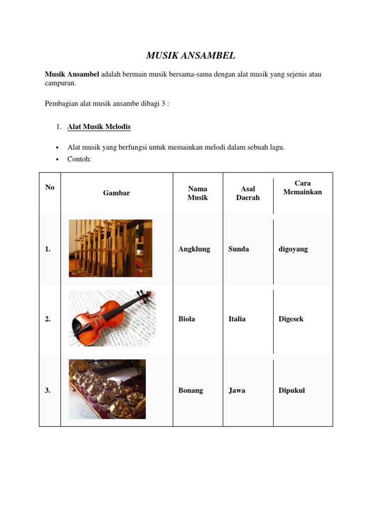 Beberapa contoh alat musik ini misalnya drum, marakas, simbal, tamborin, timpani, triangle, konga, timpani, kastanyet, rebana, tifa. Ansambel adalah suatu penyajian music dengan mempergunakan alat musik sederhana munurut bentuknya, dibedakan atas ansambel sejenis. Alat musik melodis alat musik yang berfungsi untuk memainkan melodi dalam sebuah lagu. Bunyi alat musik ini dihasilkan dengan cara ditiup dan menggunakan kedua tangan untuk mengatur nadanya. No gambar nama musik asal daerah cara.
