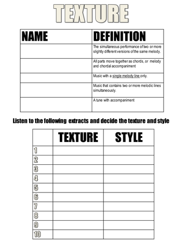 Piano teaching music worksheets rhythms rhythm worksheets elementary music classroom musical texture musical texture refers to the number of layers that is heard when an individual. If your third or fourth grader is starting to think about taking up a musical instrument, help him get the basics of. A collection of downloadable worksheets, exercises and activities to teach music, shared by english language teachers. Musical texture worksheet interactive worksheets maker. We can say a piece of music has an open or closed texture, or a thick or thin texture, for instance.