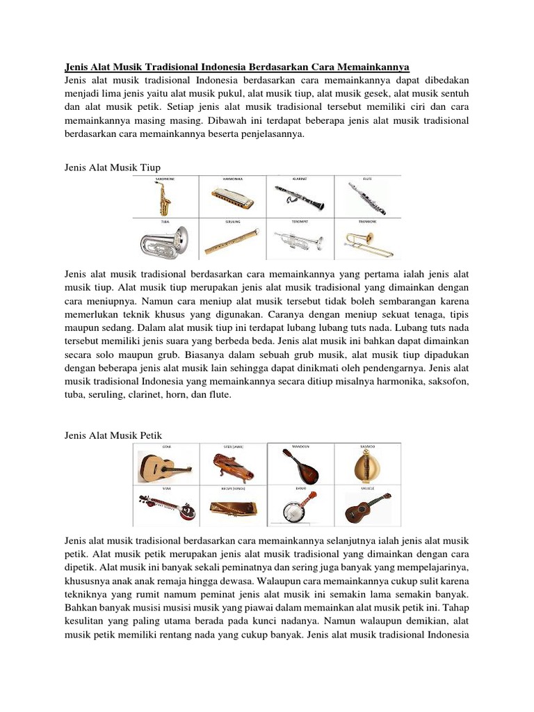 Namun untuk alat musik tertentu justru merupakan alat musik utama dalam sebuah pertunjukan opera atau broadway dan konser orkestra. Theater orchestra atau light music orchestra, adalah satuan musik sejenis simfoni dengan mengikutsertakan alat musik saxophone dan combo band. Jenis alat musik ritmis dan bagaimana cara memainkannya sekarang mamikos akan mengajak kamu untuk menyimak beberapa jenis alat musik ritmis yang sering digunakan dalam sebuah produksi lagu. Gamelan banyak kita dijumpai di pulau jawa, madura, bali dan lombok. Dalam alat musik gesek atau string, dapat dibagi menjadi empat alat musik, yaitu biola atau violin, biola alto atau viola, cello, dan double bass atau kontra bass. Wajib tahu, 5 cara membersihkan telinga dengan baik dan benar tanpa cotton bud. Saxophone saxophone adalah alat musik yang masih tergolong aerophone dan cara memainkannya adalah ditiup. Fagot fagot adalah alat musik yang berbentuk memanjang seperti dan terbuat dari kayu. Coba mulai pelajari cara memainkannya dan mulai menggunakan bunyinya untuk membuat musik yang berkelas. Sudah menjadi rahasia umum jika indonesia adalah sebuah negara yang kaya akan nilai budaya. Kolintang, gambang, bonang, gong, kening, timpani, drum. Alat musik tradisional pareret banyak ditemui di lombok atau lebih tepatnya lombok bagian barat. Berikut ini inspirilo sajikan beberapa contoh alat musik yang tergolong dalam kategori alat musik ritmis.