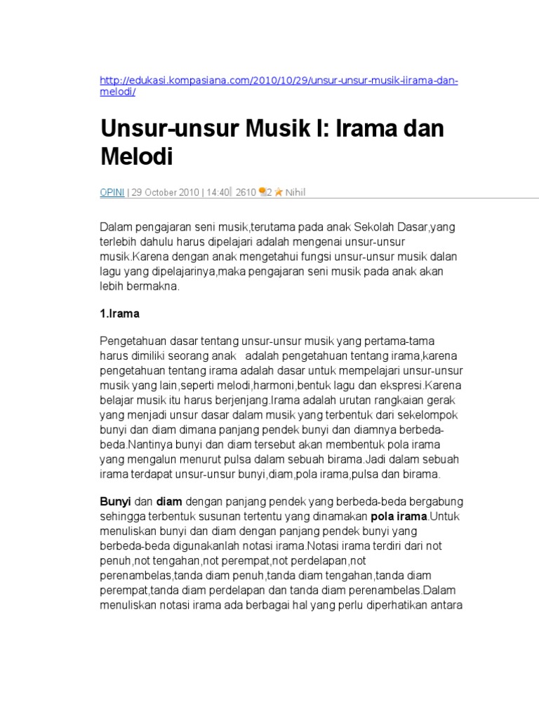 Unsur dasar struktur terbagi kedalam beberapa unsur yaitu: Sebuah komposisi akan berantakan jika tidak mengikuti kaidah penggunaan birama. Angka dibagian atas (penyebut) menunjukan nilai nada dalam satu ketukan. Bunyi bisa diartikan sebagai unsur suara yang dapat diberdayakan menjadi kesatuan harmoni dalam suatu kegiatan musikal. Liputan6.com, jakarta irama adalah salah satu unsur penting dalam seni musik. Musik atau irama yang ada dalam unsur seni tari bisa membuat suasana menjadi lebih hidup, harmonis, dan sesuai dengan makna tarian tersebut. Struktur irama lagu menentukan kapan nada dimainkan, berapa lama, dan dengan tingkat penekanannya. Unsur wirama menunjukkan bahwa gerak yang dihasilkan penari selaras dengan musik pengiring, baik irama atau tempo. Tetapi menurut saya, hal itu lebih sering dipakai dalam analisis harmoni. Musik adalah seni pendengaran, oleh kerena itu hal yang paling pentng unuk diperhatikan adalah suara. Oleh karena itu, unsur utama dalam tari berikutnya adalah wirama. Tetapi dalam penyajian musik secara langsung, unsur ini tidak pernah tertulis dalam partitur. Iringan musik akan memberi kesan hidup pada gerakan penari.
