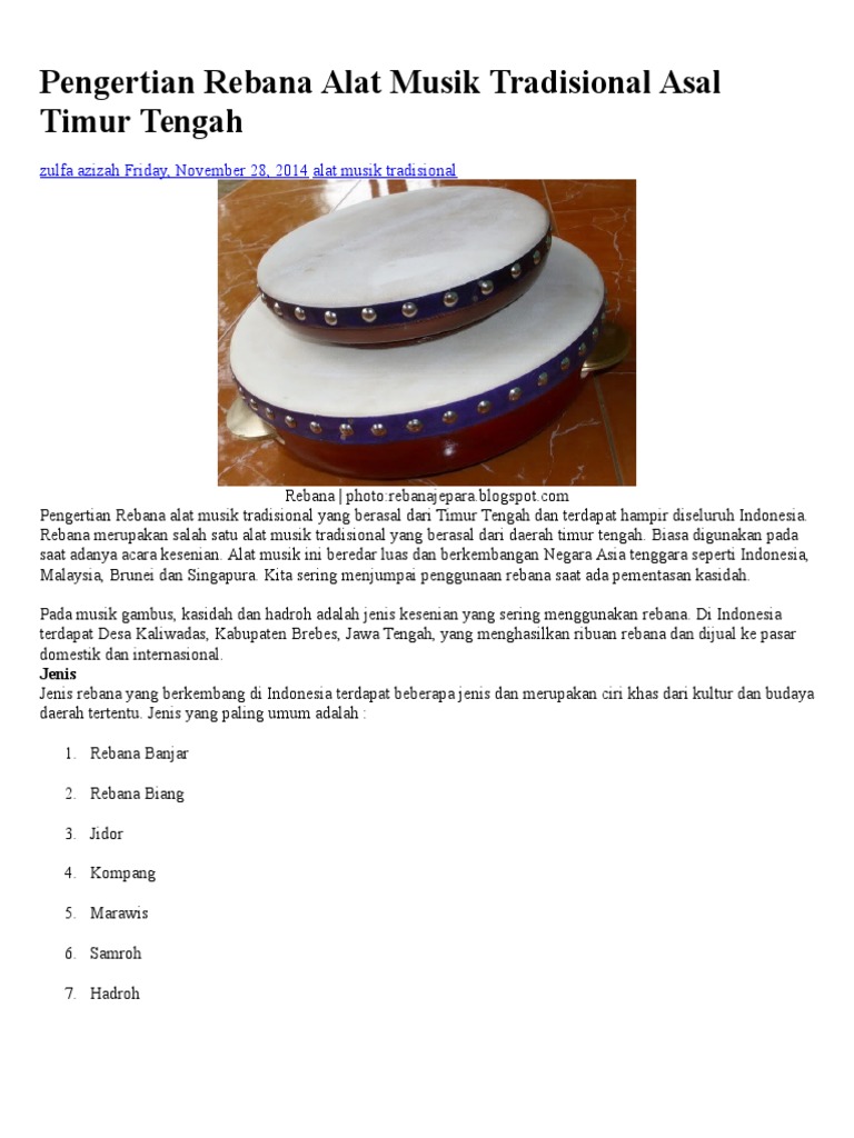 Distributor Alat Musik Tradisional Rebana Sulawesi Utara Madaniah from madaniah.co.id Terbang rebana terbuat dari bahan kayu pipih yang dilubangi di bagian tengahnya. Salah satu permasalahan dalam pengajaran seni di Bentuk dan jenis instrumen ditinjau dari bentuk dan jenis instrumen, bahwa semua alat utama musik rebana berbentuk bulat yakni terbang genjring, terbang kempling, dan gembur. Semuanya sudah dilengkapi dengan aksesoris dan tasnya. Rebana berbentuk bulat, datar dan lebar dan dapat dengan mudah dipegang dengan satu tangan. Seperti dipetik, digesek, ditiup, dipukul dan lain sebagainya. Berdasarkan fungsinya alat musik dibedakan menjadi tiga jenis, yaitu alat musik ritmis, alat. Alat musik sulawesi selatan yang satu ini termasuk jenis membranofon artinya yaitu nada yang dihasilkan berasal dari selaput yang bergetar.