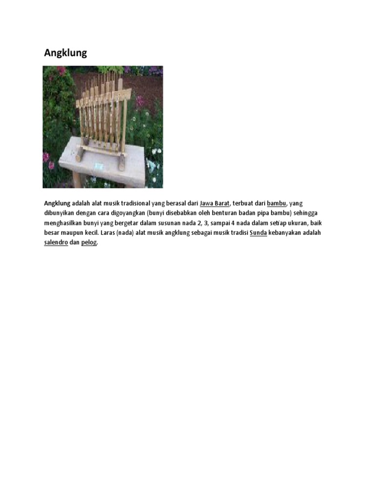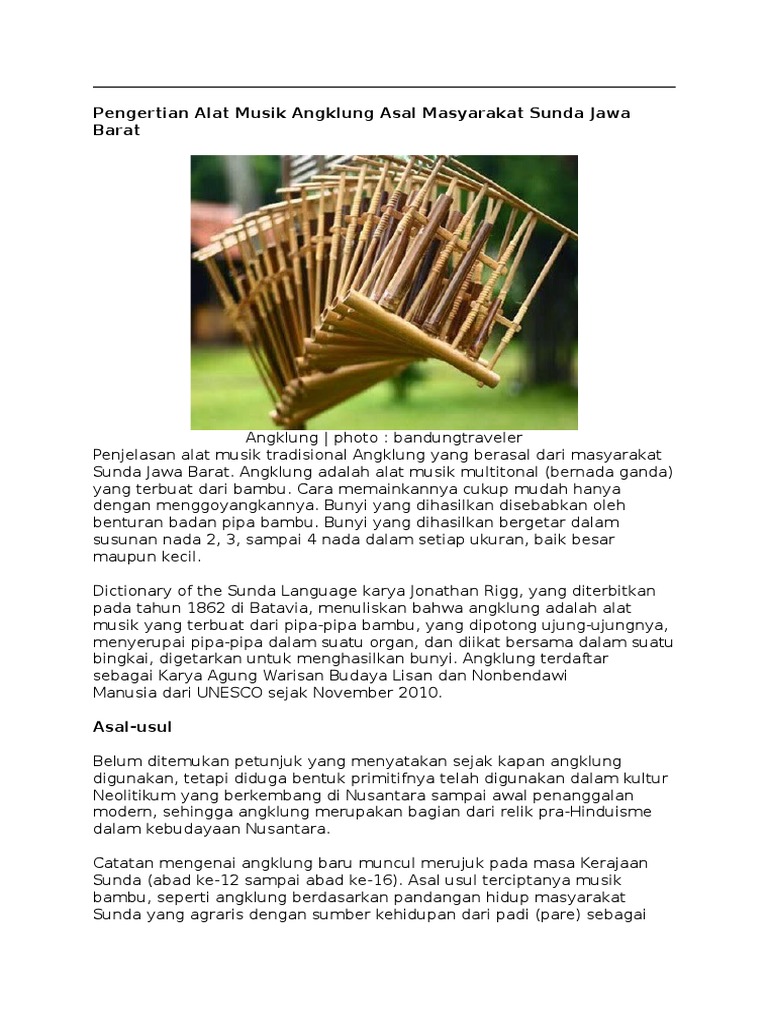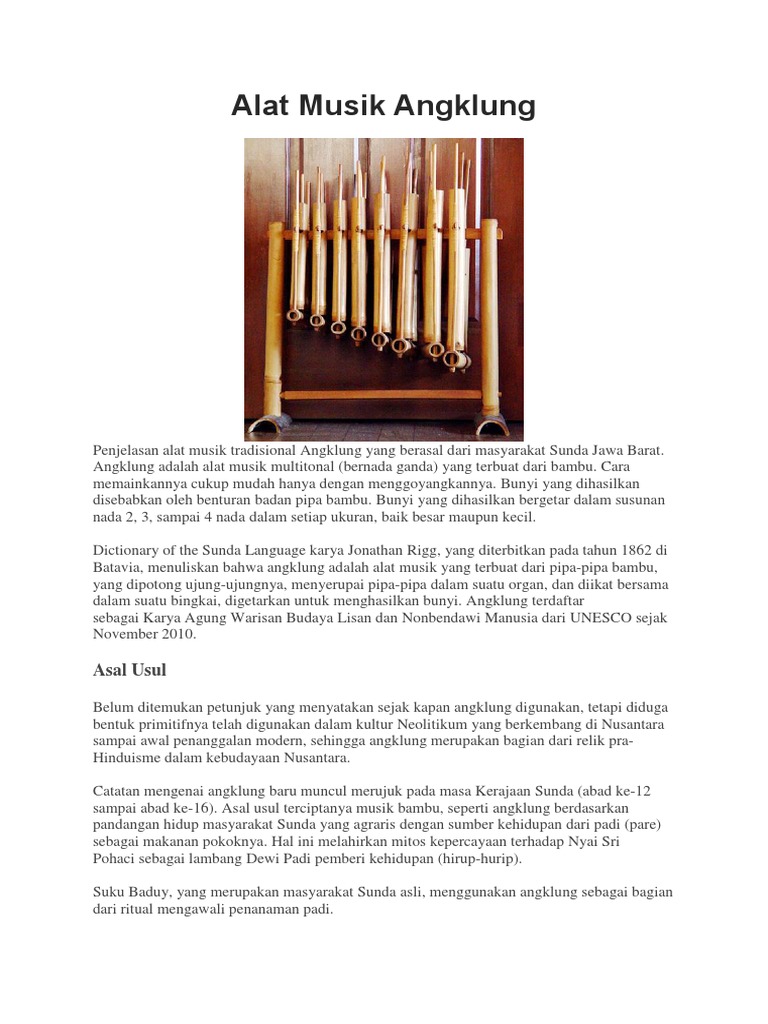 Berasal dari provinsi jawa barat angklung adalah alat musik tradisional khas suku sunda. Posisi angklung sebagai alat musik mulai tersisihkan dengan adanya alat musik yang modern. Masyarakat baduy yang dianggap sebagai. Gitar adalah alat musik tradisional yang berasal dari spanyol. Sarun atau saron adalah alat musik tradisional yang berasal dari kalimantan tengah. Alat musik tradisional ini banyak tumbuh dan berkembang di pulau jawa kecapi adalah alat musik yang dimainkan dengan cara dipetik. Suara yang dihasilkan dari alat musik ini terbilang simpel dan enak di dengar, jika kalian ingin mempelajarinya pun tidaklah sulit. Maka, tidaklah heran banyak orang yang menganggap kedua alat. An sangat digemari oleh semua kalangan hingga saat ini. Kata angklung sendiri berasal dari dua kata bahasa sunda, yaitu. Alat musik khas daerah sunda yang sudah mendunia ini merupakan alat musik yang menghasilkan dua nada dan dimainkan dengan cara menggoyangkan tubuh angklung. Angklung terbuat dari bambu dan dimainkan dengan cara digoyangkan. Alat musik angklung yang berasal dari daerah jawa barat yang mempunyai jenis bunyi ideofon.