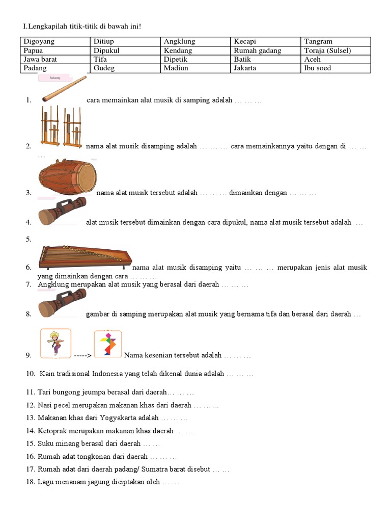 Setiap acara adat jawa yang besar bonang selalu ada untuk mengiringi acara tersebut. Alat musik tradisional lainnya yang juga berasal dari pulau jawa adalah gamelan. Kita tahu, daerah yang sering memainkan alat gamelan adalah bali, jawa timur, jawa tengah, jawa barat dan sumatra serta daerah lainnya. Bonang berasal dari daerah jawa timur, dan cara memainkanya sangat mudah yaitu dengan dipukul yang menghasilkan bunyi ideofon. Selain angklung alat kesenian tradisional jawa barat lain yang dipergunakan dalam kesenian angklung bungko adalah gendang, tutukan, klenong dan gong. Angklung dikenal sebagai alat musik yang berasal dari tanah sunda yakni jawa barat. Sudah menjadi rahasia umum jika indonesia adalah sebuah negara yang kaya akan nilai budaya. Calung adalah alat musik dari daerah. Biasanya, dikenal dengan ciri khasnya. Talempong talempong adalah seni musik tradisi dari minangkabau. Alat musik tradisional indonesia satu ini berasal dari daerah utara daerah sumatera, tepatnya di pulau nias. Kolintang (kulintang) adalah alat musik yang berasal dari daerah minahasa (sulawesi utara). Angklung adalah alat musik tradisional yang berasal dari jawa barat, terbuat dari bambu, yang dibunyikan dengan cara digoyangkan (bunyi disebabkan oleh benturan badan pipa bambu) sehingga menghasilkan bunyi yang bergetar dalam susunan nada 2, 3, sampai 4 nada dalam setiap ukuran, baik besar maupun kecil.