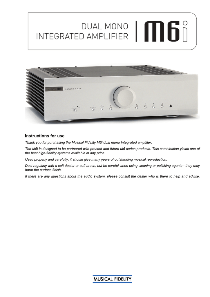 We often assume that quality is directly proportional to mass, but in this case that might actually be true. Any thoughts concerning particular strengths of each? In this era of flyweight amplifiers, musical fidelity's m6si ($2999 usd) is a middleweight. The m1dac was enthusiastically reviewed by sam tellig in march 2011, and i wrote about the most recent version in january 2013. Upon embarking on this review i was shocked to discover that the musical fidelity m6 500i is a dual mono integrated amp, literally two mono integrated amps in one chassis! The m6i is a highly flexible design, allowing it to be used in a wide range of systems. The first was expected, the second two slightly feared. It boasts very accurate riaa equalization, within ± 0.5db from 20 hz to 20 khz), and is accurate to 50 khz. The m6si cross talk is outstanding: Page 1 instructions for use thank you for purchasing the musical fidelity m6i dual mono integrated amplifier. Its stability margins are huge so it will drive any loudspeaker easily. Takes the m6 to a whole new level and with more power and facilities. It has a deep, powerful bass that sounds just a little overstated.