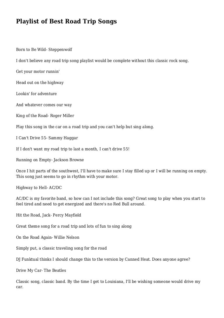 This road trip playlist includes 25 classics which everyone will enjoy. Updated on 7/7/2017 at 4:08 pm. The best driving songs 2021 the perfect playlist for your road trip. Below is a list of some of the best songs for a road trip, i have even gone as far as providing you with a spotify link so you can have access to all these killer songs with the touch of a button. I hope these 101 best road trip songs prepared you for your next journey. Just don't be surprised if your passengers want to hear them on repeat! I know, i know, you're looking at a way to thank me, feel free to do so by sharing this post on pinterest 😉. 100 best road trip songs This list features a lot of cool songs you've to put on your phone. Listen to the music the doobie brothers. Hitting the road for a family road trip just isn't the same without a rockin road trip playlist to set the mood! However, and always remember this, go out there and create your own travel songs. Classic road trip songs the ultimate playlist to fuel your good mood while on the road.